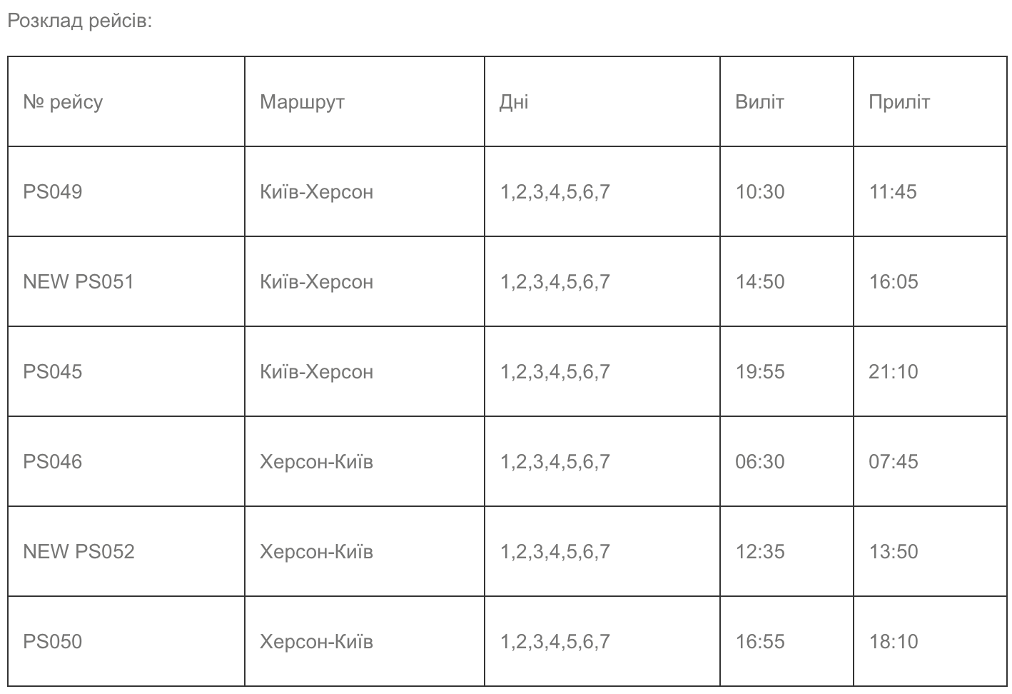 Дополнительный рейс будет выполняться с вылетом из киевского аэропорта Борисполь в 14:50 и вылетом из Херсона 12:35.Время в пути составит 1 час 15 минут. Для рейсов будут использованы 48-местные самолеты Embraer 145.