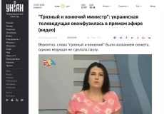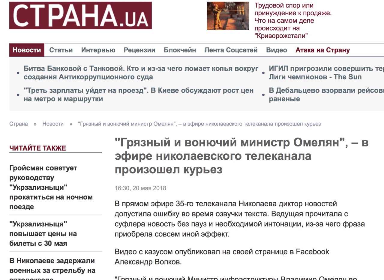 В самом начале выпуска ведущая зачитала подводку к сюжету и интонационно недостаточно обозначила точку после его названия «Грязный и вонючий». «Грязный и вонючий министр инфраструктуры Владимир Омелян во время рабочего визита в Николаев раскритиковал состояние николаевского ж/д вокзала», — произнесла она.