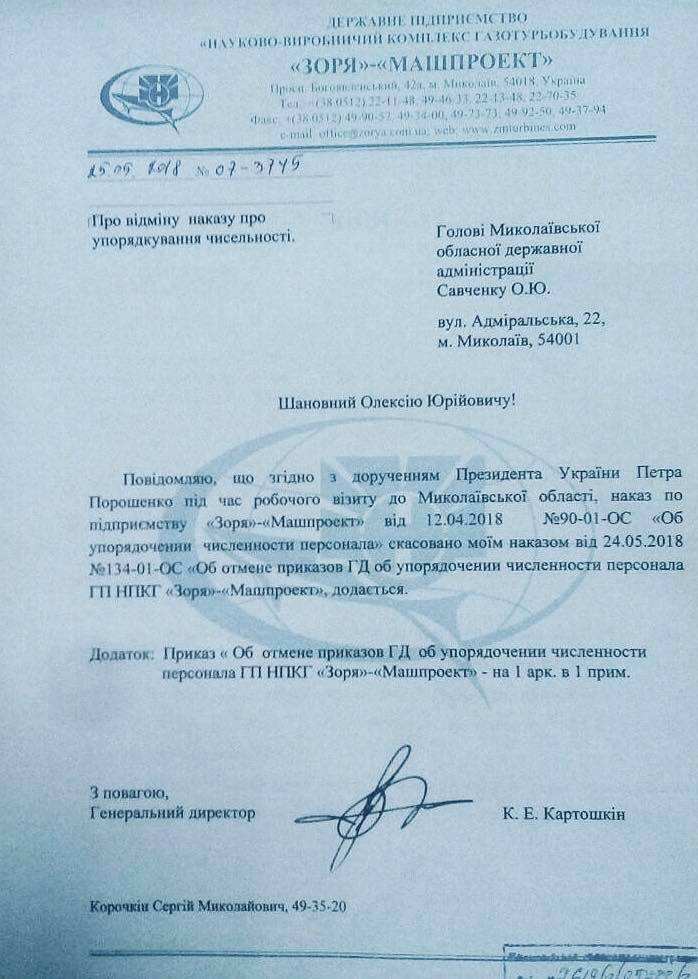 Генеральный директор государственного предприятия «Зоря» — «Машпроект» Константин Картошкин, выполняя поручение президента Украины Петра Порошенко, отменил приказ о сокращении штата работников предприятия.