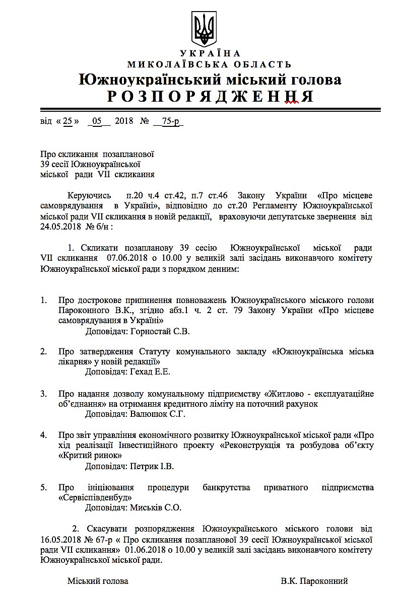 Южноукраинский городской голова Виктор Пароконный, ссылаясь на депутатское обращение от 24 мая 2018 года, созвал внеочередную сессию городского совета, где первым вопросом в повестке дня значится вопрос об импичменте мэра.