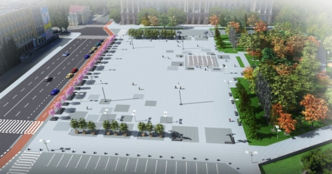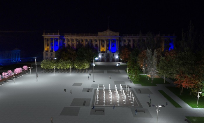 Существующую часть площади предполагается оставить максимально открытой для возможности пребывания большого количества людей во время проведения массовых мероприятий. Композиционным центром площади предлагается сделать большой светомузыкальный пешеходный фонтан, расположенный в глубине площади на одной оси с центральным входом дома Городского совета.