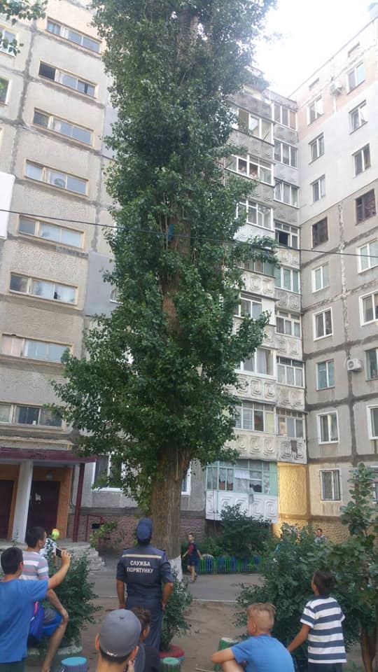 В Николаеве спасателям пришлось снимать с тополя ребенка, который забрался на дерево на уровень третьего этажа, чтобы снять застрявший мяч.