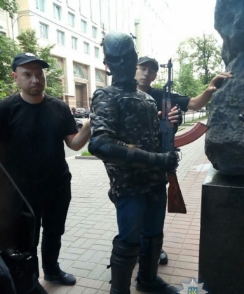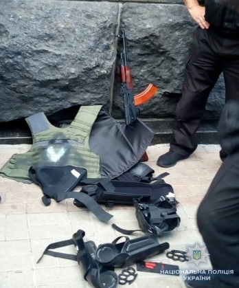 В пресс-службе полиции Киева сообщили, что молодой юноша в амуниции и маске на лице вышел из такси возле Кабмина и двигался в направлении Верховной Рады Украины, где состоялась массовая акция. Его задержали: во время поверхностного осмотра у него изъяли предмет, похожий на карабин, два кастета, ножи и дымовую шашку.