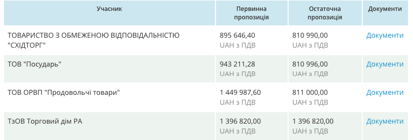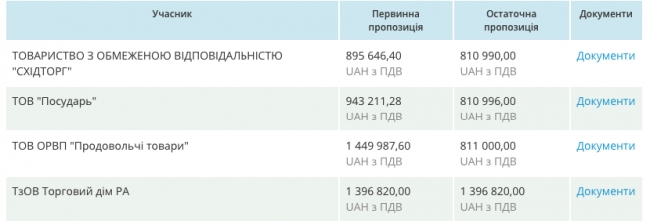 На данный момент, в тендере принимают участие 4 фирмы: ООО «Посударь», которая предлагает предоставить посуду за 810 тысяч, ООО ОРВП «Продовольственные товары» за 811 тысяч, ООО «Торговый дом РА» выступило с предложением 1,3 миллиона гривен и ООО «Схидоторг» с предложением в 810 тысяч.