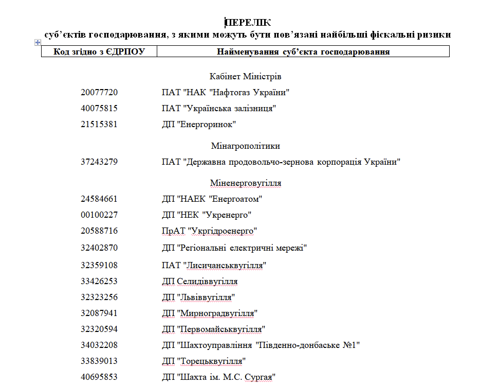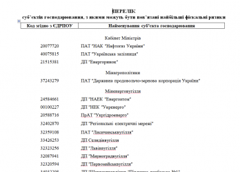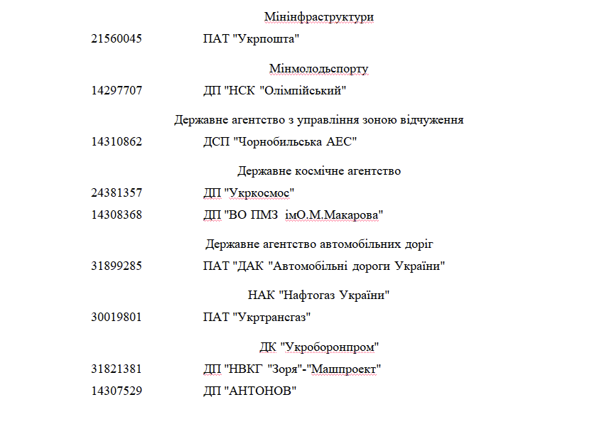 В список также попало предприятие ГП «Антонов», которое также относится к «Укроборонпрому». Всего список насчитывает 25 субъектов среди которых, «Нафтогаз», «Укрзалізниця», стадион «Олимпийский», НАЭК «Энергоатом», «Укрпочта», ГП «Укркосмос», «Укртрансгаз», «Укрэнерго», «Укргидроэнерго».