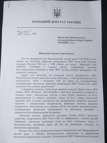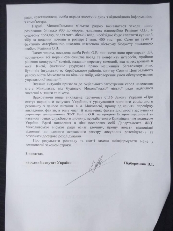 В частности, Вадим Пидберезняк просит проверить действия заместителя директора Департамента ЖКХ Николаевского горсовета Александра Репина на предмет злоупотребления служебным положением.