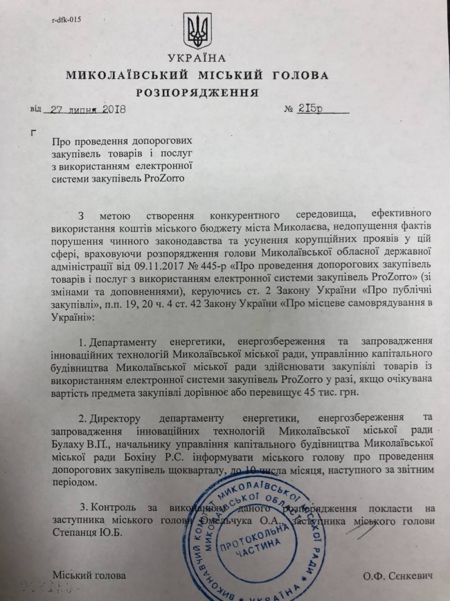 Николаевский городского голова Александр Сенкевич поручил управлению капитального строительства и департаменту энергетики проводить через ProZorro все закупки на сумму больше 45 тысяч гривен.
