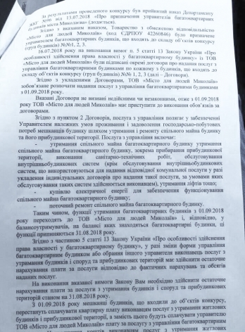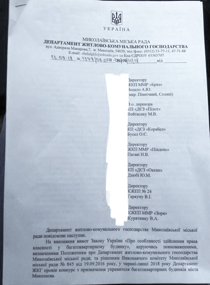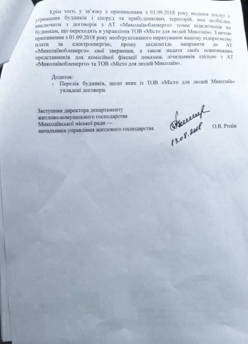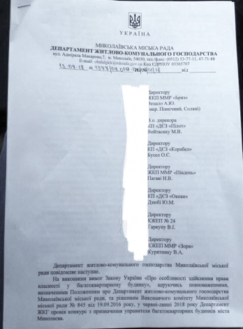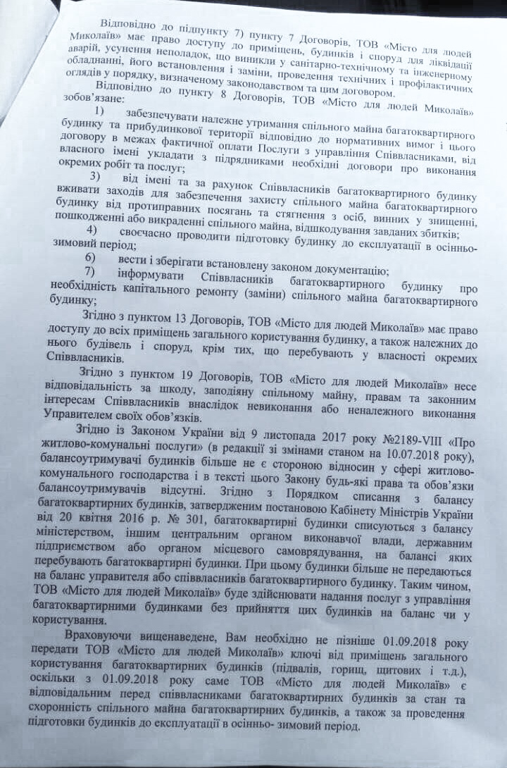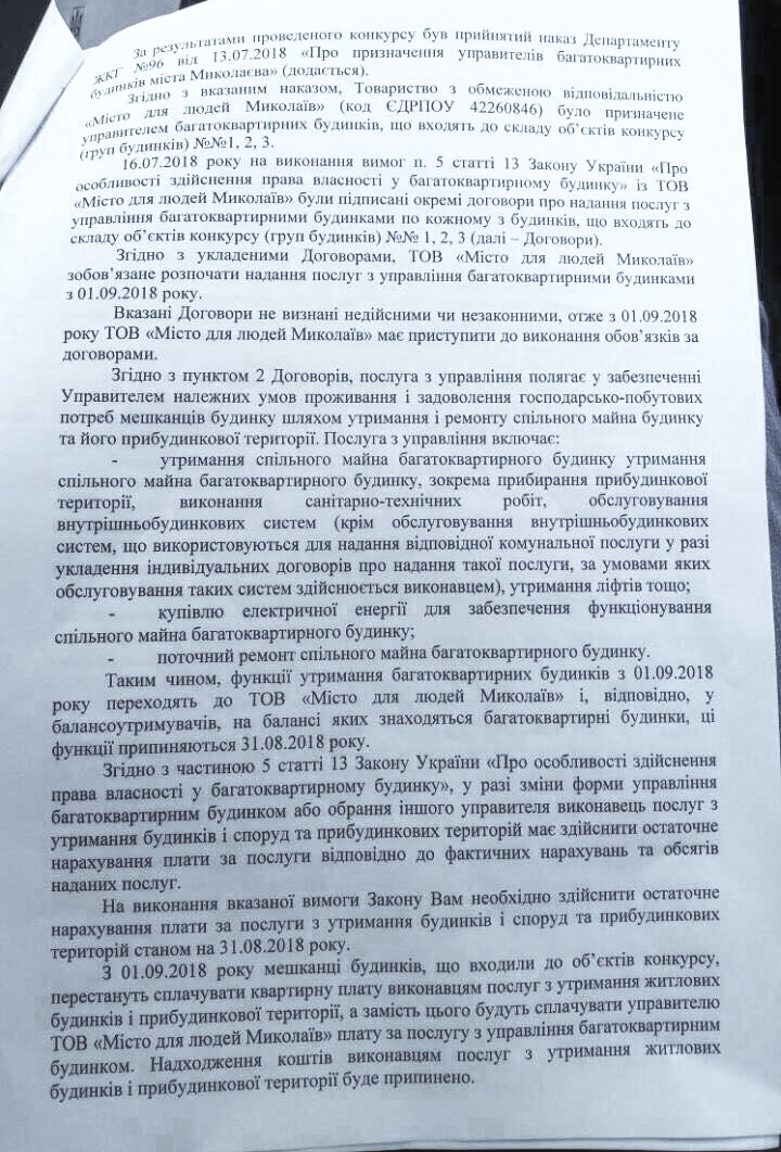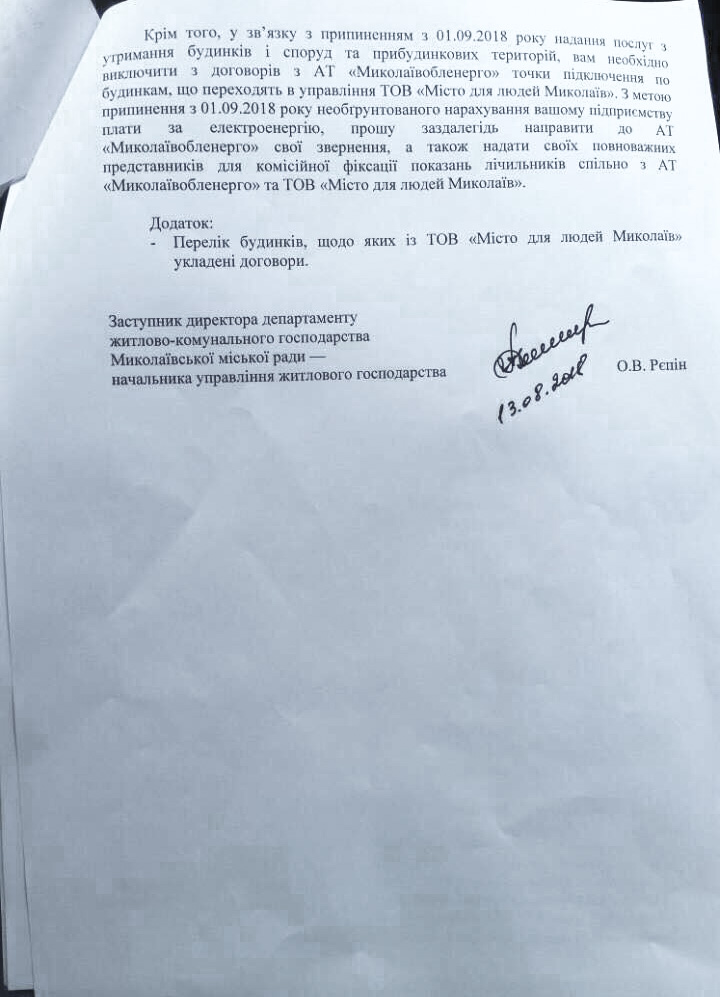 Отстраненный от должности заместителя директора Департамента ЖКХ Николаева депутат горсовета от партии «Самопомощь» Александр Репин требует от городских ЖЭКов прекратить обслуживание жилого фонда и передать его компании «Місто для людей», которая победила в конкурсе управляющих компаний, проведенном, по мнению депутатов горсовета, с многочисленными нарушениями.