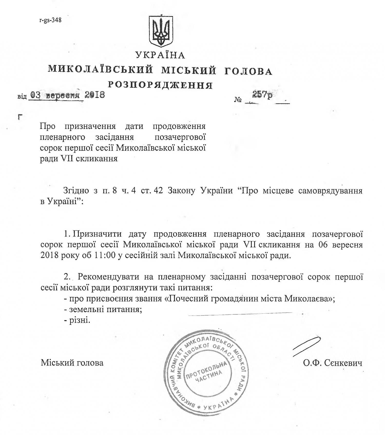 Николаевский городской голова Александр Сенкевич созвал на четверг, 6 сентября, сессию городского совета.