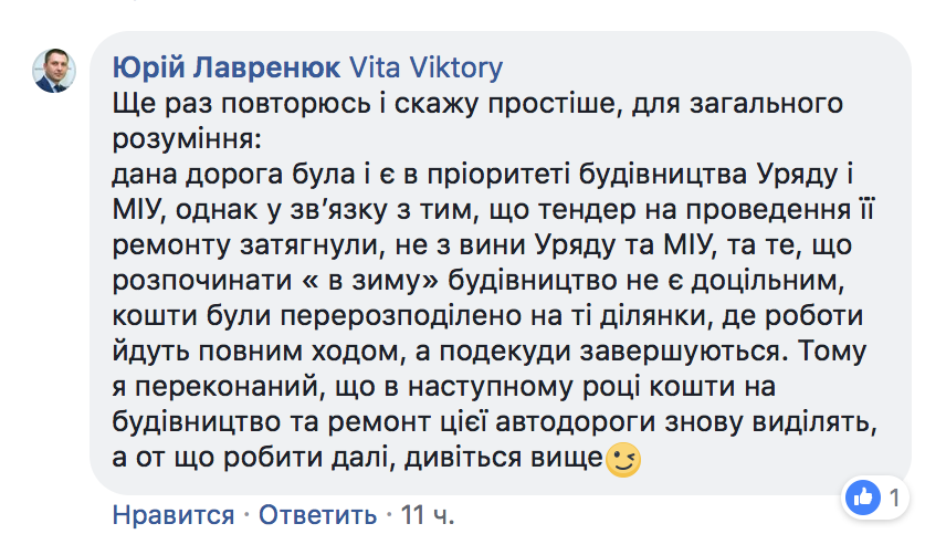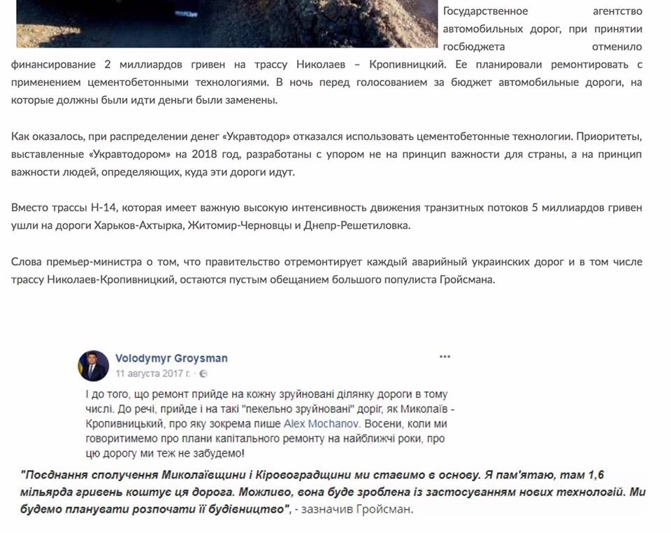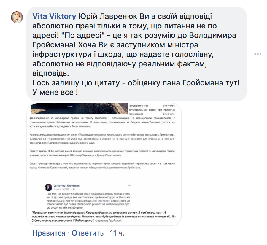 При этом она прикрепила к своему комментарию сриншот заявления премьер-министра Владимира Гройсмана, где он говорил о приоритетности строительство дороги Н-14 «Николаев - Кропивницкий».