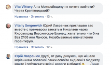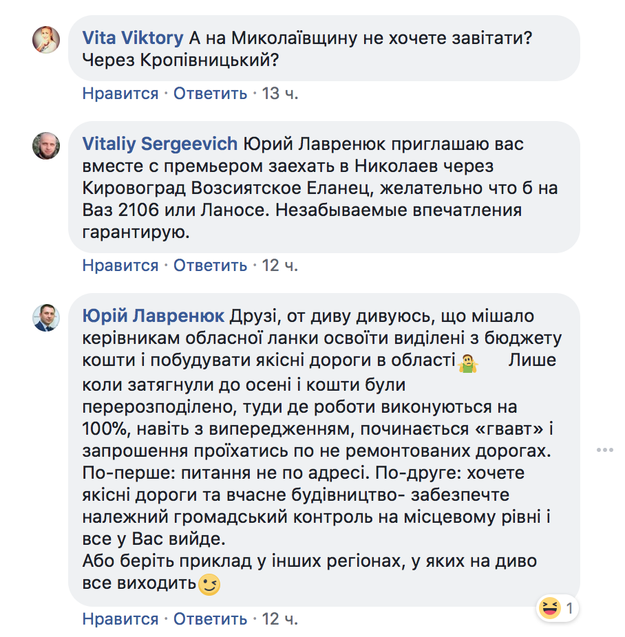 В социальной сети Facebook, комментируя публикацию замминистра инфраструктуры Юрия Лавренюка о строительстве взлетно-посадочной полосы в одесском аэропорту, глава Николаевского облсовета пригласила чиовника посетить Николаевщину и проехаться по трассе «Кропивницкий - Николаев».