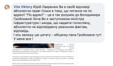 — Вы в своем ответе абсолютно правы только в том, что вопрос не по адресу! «По адресу» - это, я так понимаю, к Владимиру Гройсману! Хотя вы являетесь заместителем министра инфраструктуры, и жаль, что даете голословный, абсолютно не отвечающий реальным фактам ответ, - ответила ему Виктория Москаленко.