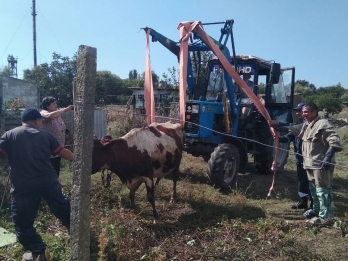 Сотрудники ГСЧС с привлечением трактора от Очаковской коммунальной службы благоустройства и автомобиля ГАЗ-53 от Черноморской ОТГ корову неповрежденной вытащили из ямы.