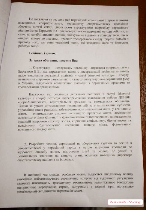 На сегодняшний день родительский комитет воспитанников секции плавания направил открытое письмо на имя главы Николаевской ОГА Алексея Савченко, мэра города Александра Сенкевича и генерального директора государственного предприятия «Заря»-«Машпроект» Константина Картошкина.