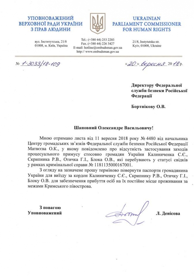 Уполномоченный Верховной Рады по правам человека Людмила Денисова 11 сентября назвала ответ от российской ФСБ относительно моряков из Очакова, которые незаконно удерживаются в Крыму, очередной отпиской и потребовала вернуть морякам паспорта.