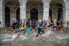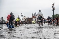 Профессиональные спортсмены, а также бегуны-любители были вынуждены пробираться через паводковые воды во время Венецианского марафона. Уровень воды был приблизительно по щиколотку.