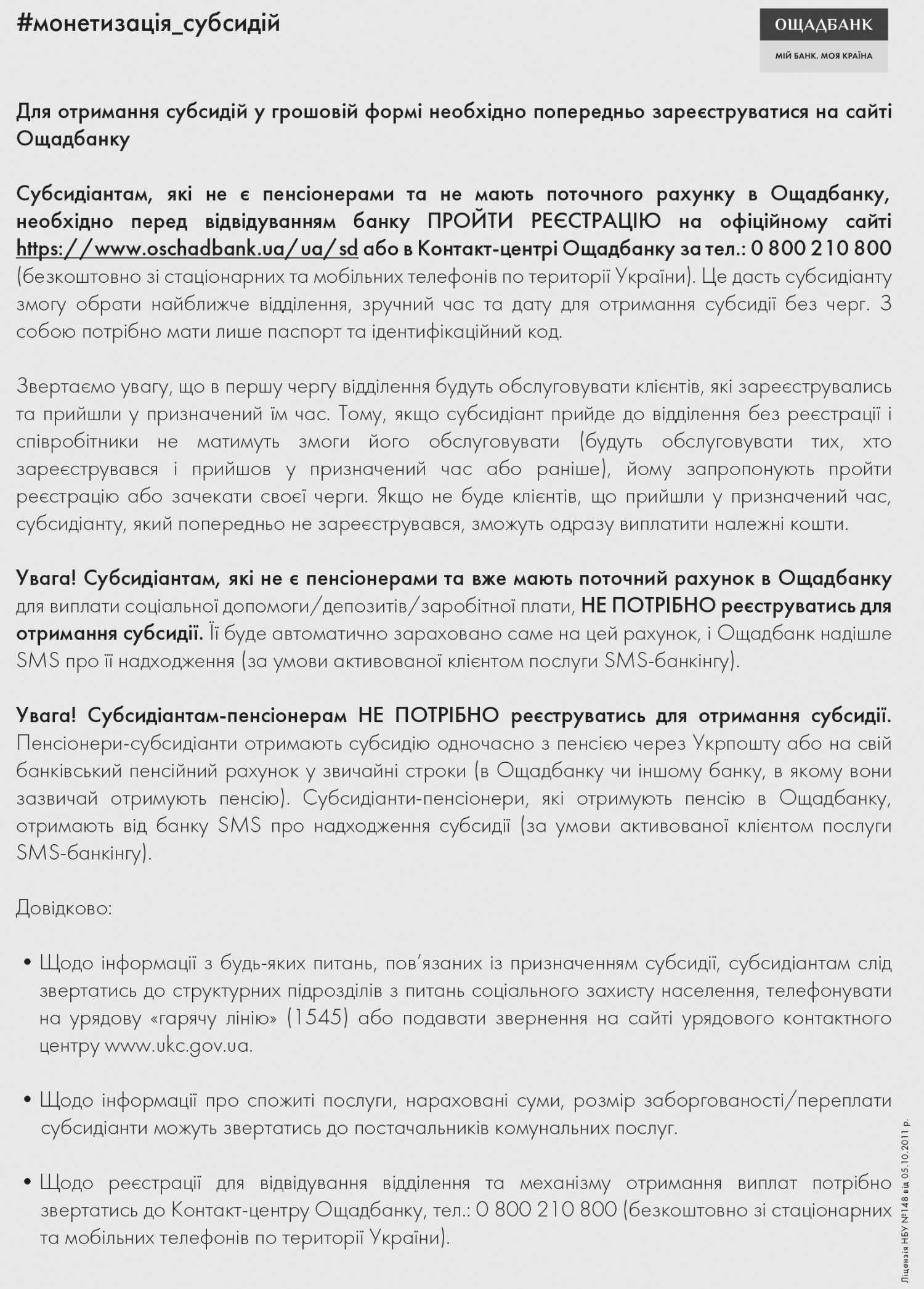 В Ощадбанке отметили, что субсидиантам-пенсионерам не нужно дополнительно регистрироваться для получения субсидии. Они получат субсидию одновременно с пенсией через "Укрпошту" или на свой банковский пенсионный счет в обычные сроки.