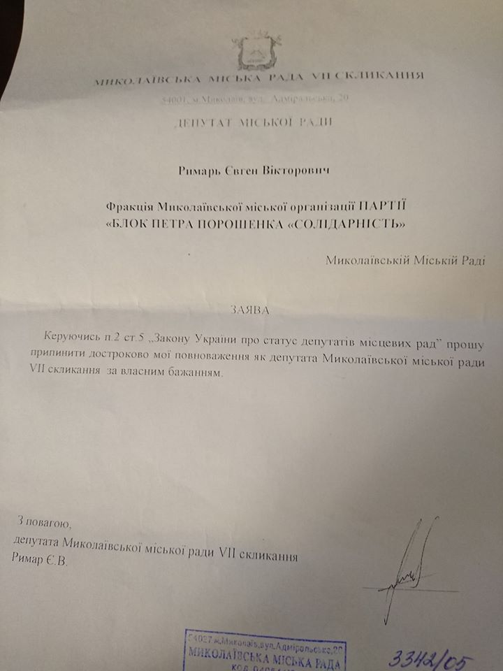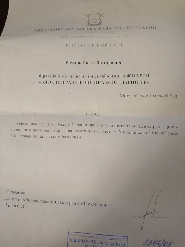 Депутат Николаевского городского совета от БПП Евгений Рымарь написал заявление о сложении депутатских полномочий.