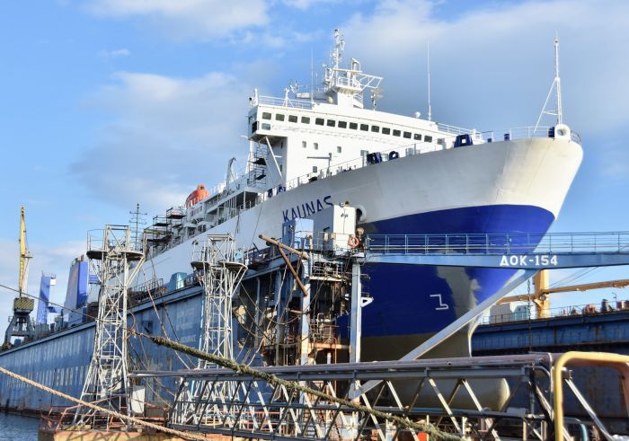 На ИСРЗ уточнили, что Kaunas находится на заводе с 24 февраля. С того времени был произведен ремонт аппарели и кормовой двери у причала. С 28 февраля судно находится в доке, где проводится ремонт подводной части корпуса и частично - надводной. Плановые сроки ремонта - 30 дней.