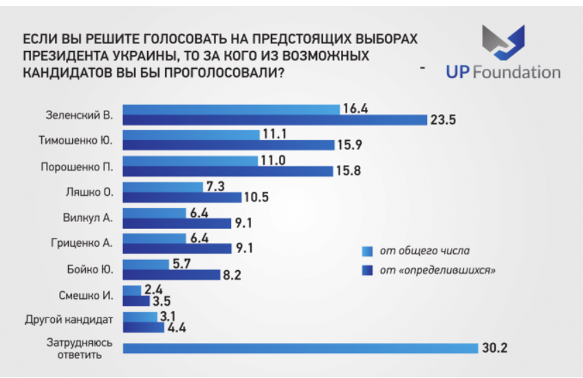 Первенство в рейтинговых показателях удерживает комик Владимир Зеленский. За него готовы проголосовать 23,5% от тех, кто определился со своим выбором. На втором месте – лидер «Батькивщины» Юлия Тимошенко - 15,9%. На третьем месте, по результатам исследования, находится действующий президент Украины Петр Порошенко - 15,5%. На четвертой позиции закрепился Олег Ляшко - 10,5%. Пятую позицию в рейтинге, по результатам исследования, с Александром Вилкулом делит Анатолий Гриценко - 9,1%.