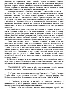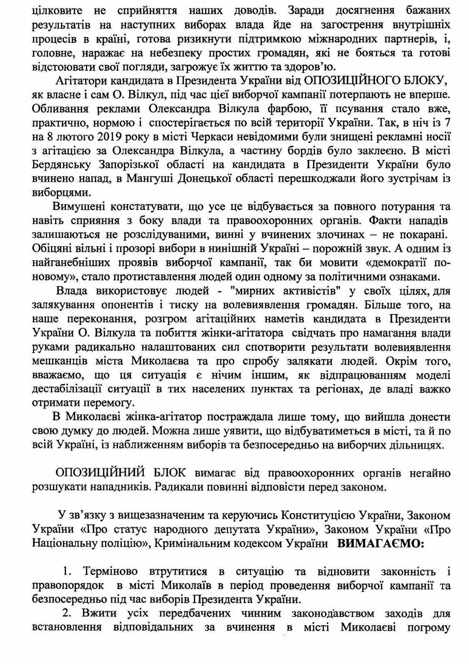 Кроме того, парламентарии-оппозиционеры потребовали от министра внутренних дел немедленно вмешаться в ситуацию и восстановить законность и правопорядок в городе Николаеве в период проведения избирательной кампании и непосредственно во время выборов Президента Украины. Фракция требует принять все предусмотренные действующим законодательством меры для установления ответственных за совершение в городе Николаеве погрома агитационных палаток Вилкула, привлечения исполнителей и заказчиков преступления к ответственности.