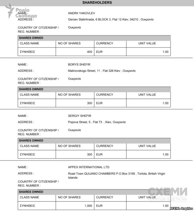 Сейчас доли в Green Family LTD распределены так: Яковлев — 400 евро, Борис Шефир — 300 евро, Сергей Шефир — 300 евро, Appex International LTD Миндича — 1000 евро.
