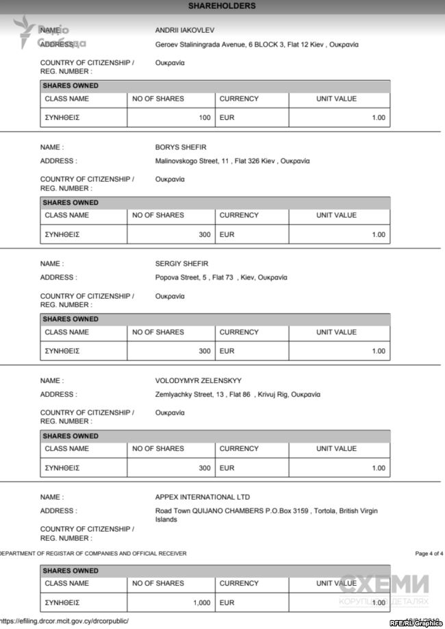 Однако еще в начале года доли распределялись иначе: Яковлев — 100 евро, Борис Шефир — 300 евро, Сергей Шефир — 300 евро, Зеленский — 300 евро, Appex International LTD Миндича — 1000 евро.
