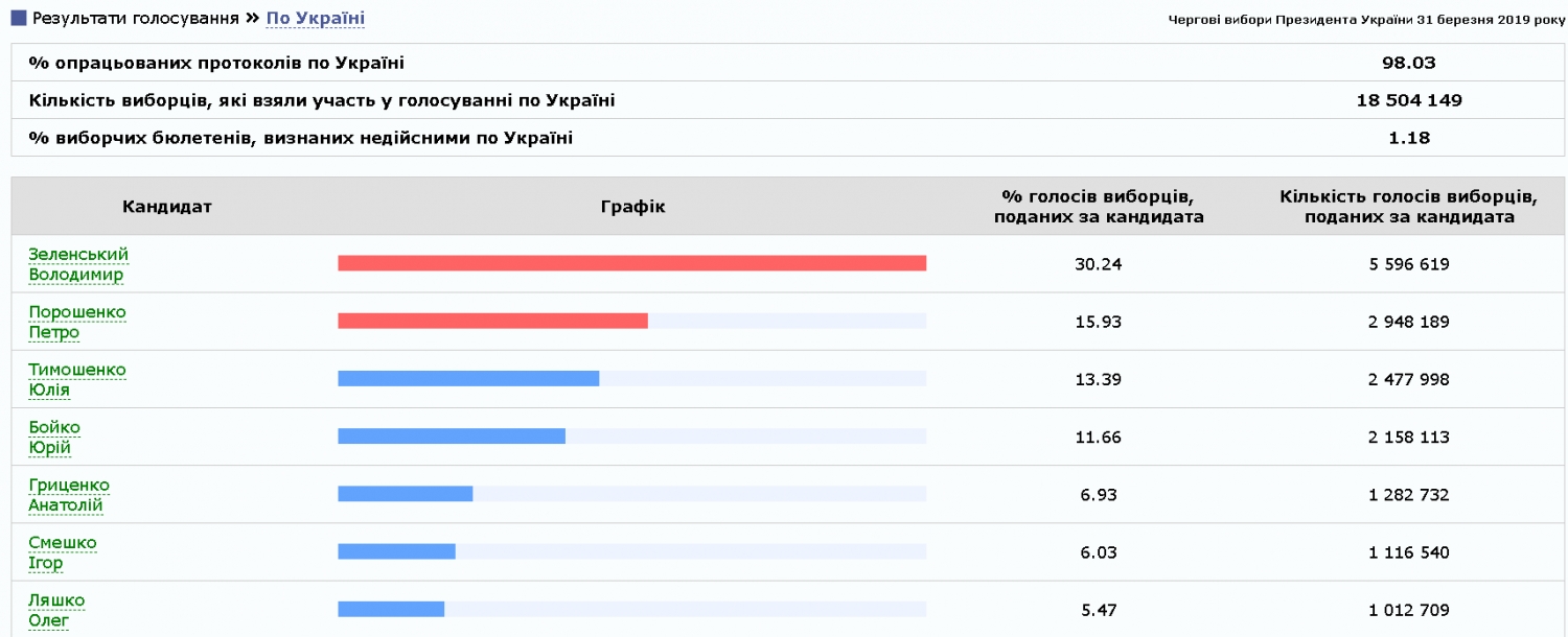 Лидирует по прежнему Владимир Зеленский, который набрал 30.24% голосов избирателей Украины. Действующий президент Украины Петр Порошенко на втором месте с результатом 15.93%. Юлия Тимошенко набрала 13.39%. Юрий Бойко - 11.66%. У Анатолия Гриценко поддержка 6.93%. Игорь Смешко с результатом 6.03%.