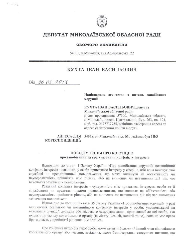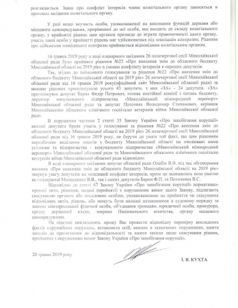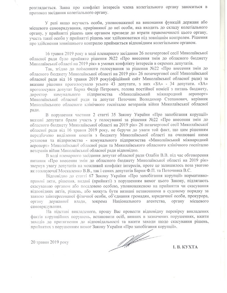 Депутат Николаевского областного совета Иван Кухта обратился в Национальное агентство по вопросам предотвращения коррупции из-за того, что двое депутатов облсовета на сессии облсовета, имея конфликт интересов, поддержали перераспределение бюджета области на 2019 год.