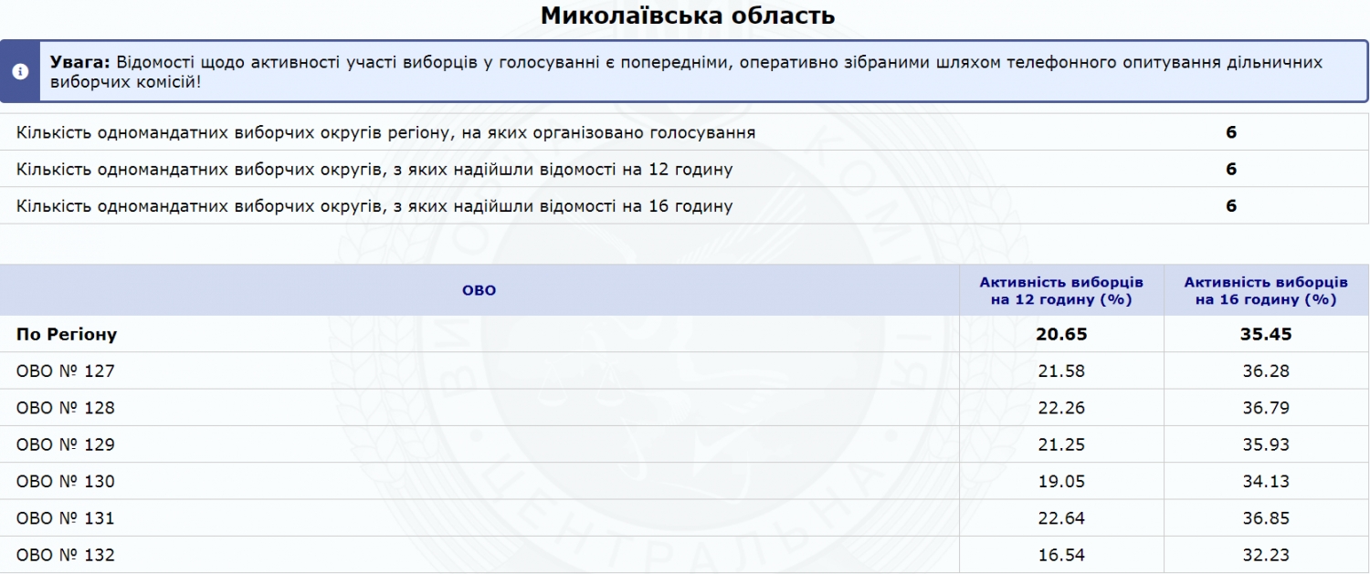ЦИК опубликовала явку избирателей по состоянию на 16:00 на всех шести округах Николаевской области. Средняя явка составила 35.45%.