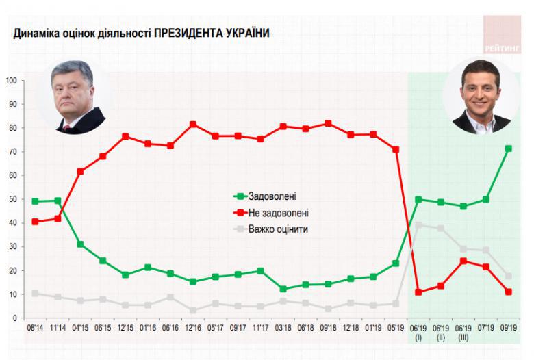 Согласно социологическому опросу группы «Рейтинг», проведенному в период с 6 по 10 сентября, 71% украинцев позитивно оценивают работу Президента Украины Владимира Зеленского.