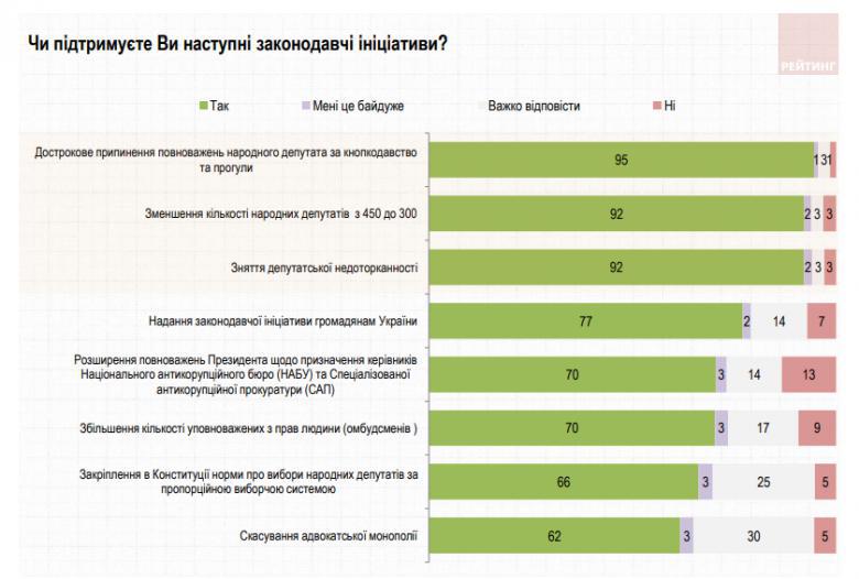 Законодательные инициативы Зеленского поддерживают больше 70% опрошенных. В частности, идет речь о расширении полномочий Президента в аспекте назначения руководителей Национального антикоррупционного бюро (НАБУ) и Специальной антикоррупционной прокуратуры (САП), а также об увеличении количества омбудсменов.