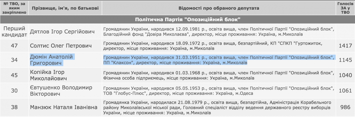 Стоит отметить, что на официальном сайте Центральной избирательной комиссии Украины значится информация о том, что Анатолий Дюмин является членом политической партии «Оппозиционный блок».