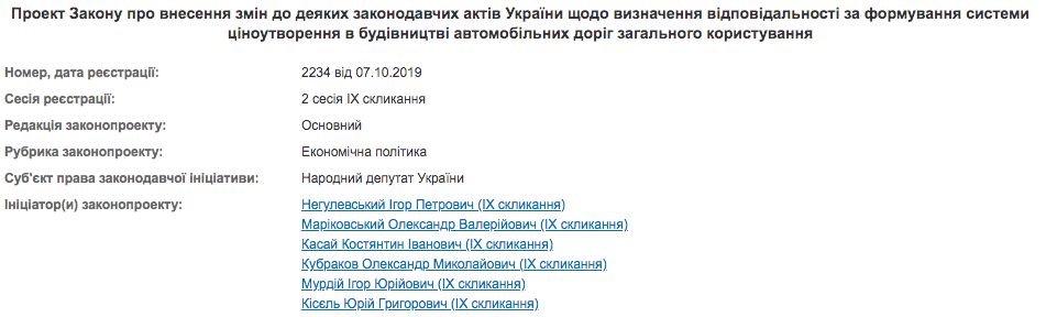 Народный депутат Украины от партии «Слуга народа» Игорь Негулевский выступил инициатором проекта Закона «О внесении изменений в некоторые законодательные акты Украины относительно определения ответственности за формирование системы ценообразования в строительстве автомобильных дорог общего пользования».