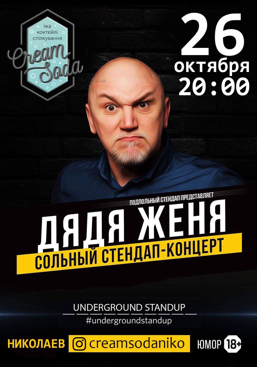 «Вы любите современный юмор без купюр и цензуры? Вам интересен самый современный жанр юмора - STAND-UP COMEDY? Тогда, именно для Вас в Николаеве, в арт-ресторане Cream Soda самый яркий, самый масштабный и самый дерзкий стендап-проект страны – Подпольный Стендап! Стендап-вечеринка «Дядя Женя - Сольный Концерт» - это, прежде всего зрелый выдержанный юмор и острые, отточенные опытом шутки. В портфолио Дяди Жени – богатый опыт участия в ТВ-проектах, и награда с международного юмористического фестиваля.