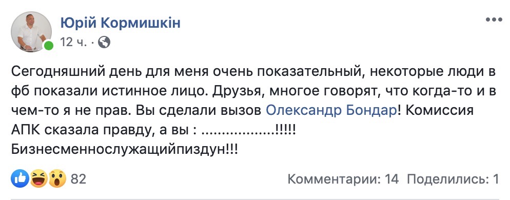 — Сегодняшний день для меня очень показательный, некоторые люди в Facebook показали истинное лицо. Друзья, многое говорят, что когда-то и в чем-то я не прав. Вы сделали вызов Александр Бондарь! Комиссия АПК (депутатская комиссия Николаевского облсовета по вопросам агропромышленного комплекса, – прим) сказала правду, а вы… Бизнесменнослужащийп*зд*н, – заявил Юрий Кормышкин.