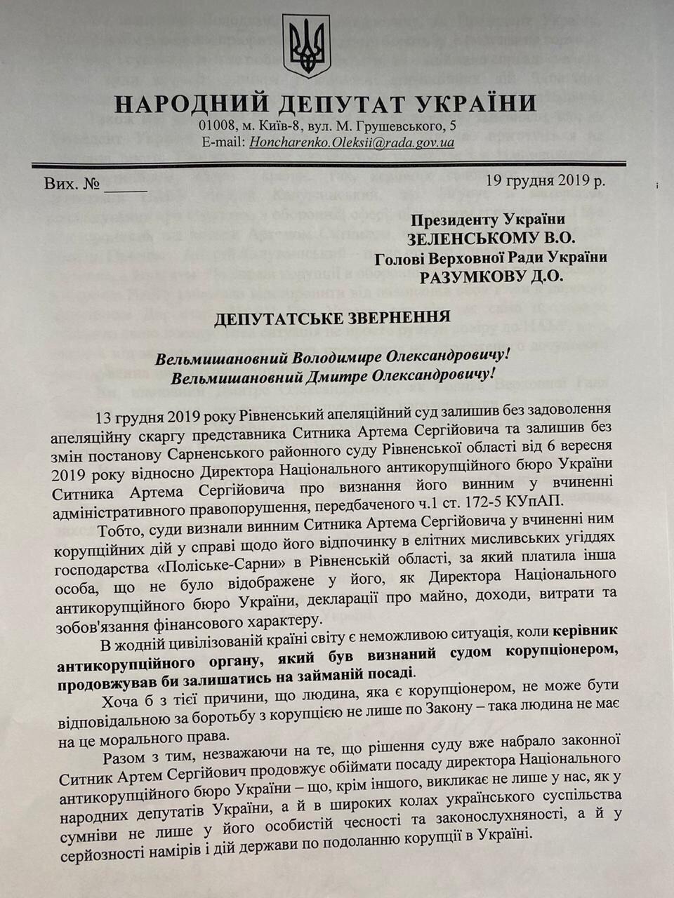 Он отметил, что несколько дней назад обратился к Президенту Украины с требованием уволить Артема Сытника, поскольку тот оказался в реестре лиц, совершивших коррупционные правонарушения.
