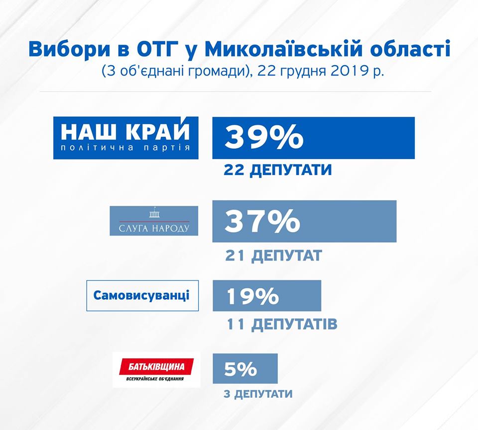 Партия «Наш край» победила на выборах в объединенных территориальных общинах (ОТГ) в Николаевской области, состоявшихся 22 декабря.