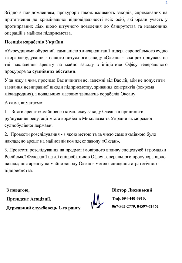 «Корабелы Украины крайне возмущены попытками некоторых чиновников (начиная с Офиса Генерального прокурора) нагло захватить самый современный судостроительный завод «Океан», которые уже больше года демонстрирует всему миру быстрый рост объемов строительства суперсовременных, особенно привлекательных для судовладельцев судов. И кораблей для ВМС также! Ведь за последние пару лет «Океан» быстрыми темпами возрождает численность высококвалифицированных корабелов и наращивает портфель заказов», - говорится в письме.