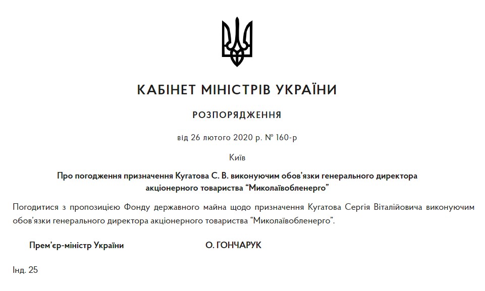 Кабинет Министров Украины согласовал кандидатуру Сергея Кугатова на должность исполняющего обязанности генерального директора АО «Николаевоблэнерго».