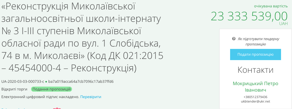 Согласно данным ресурса, 3 марта 2020 года УКС объявил тендер на реконструкцию Николаевской общеобразовательной школы-интерната № 3 I-III ступеней Николаевского областного совета по улице 1 Слободская, 74 в Николаеве стоимостью 23 миллиона 333 тысячи 539 гривен.