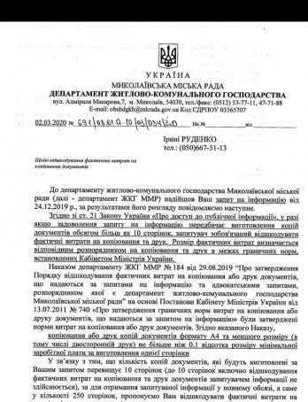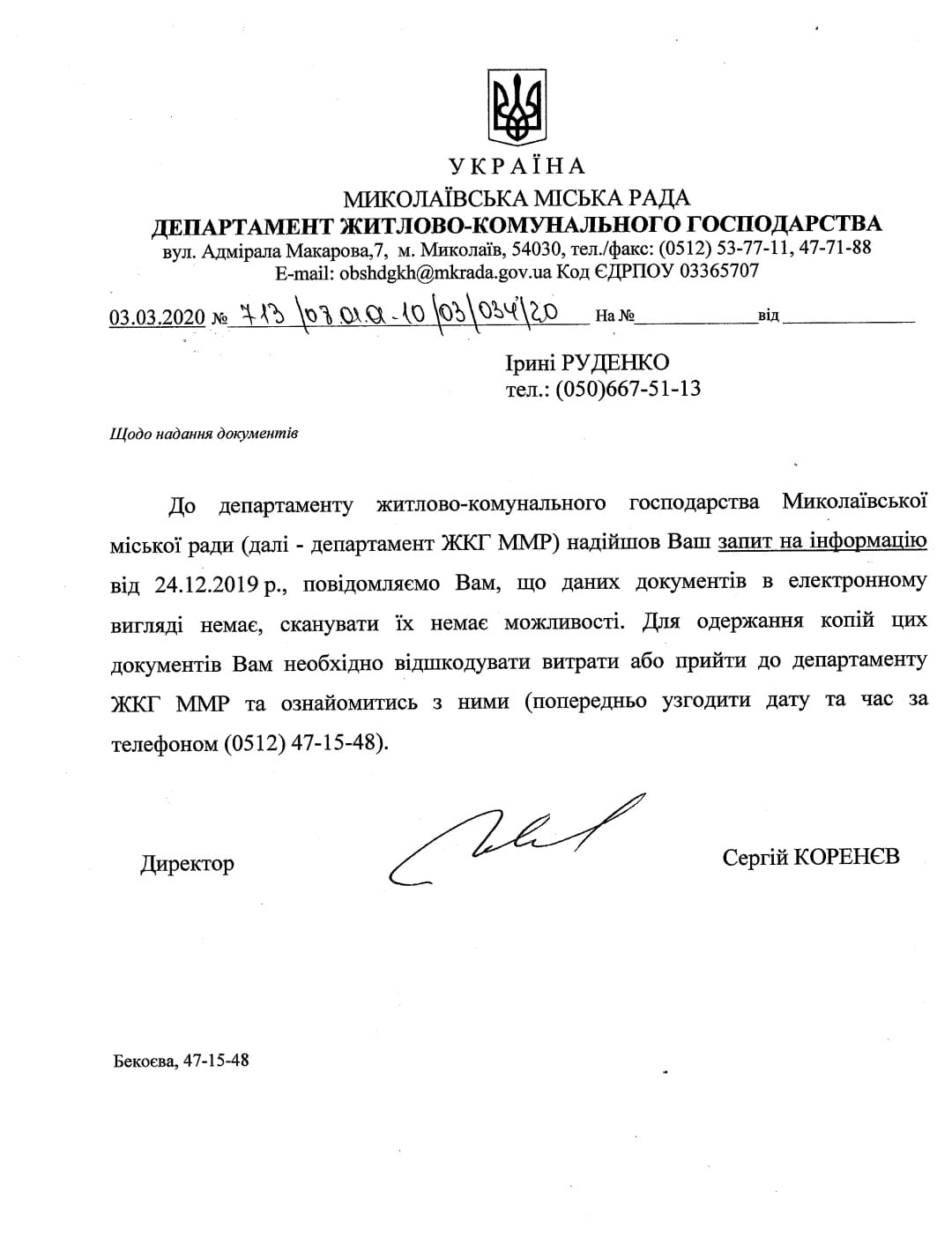 На следующий день Ирина Руденко опубликовала еще одно письмо от Департамента ЖКХ Николаева. В этом письме Сергей Коренев предложил ей прийти в Департамент и лично ознакомиться с запрашиваемыми документами либо оплатить стоимость их копирования. Чиновник сослался на то, что у Департамента нет возможности из отсканировать.