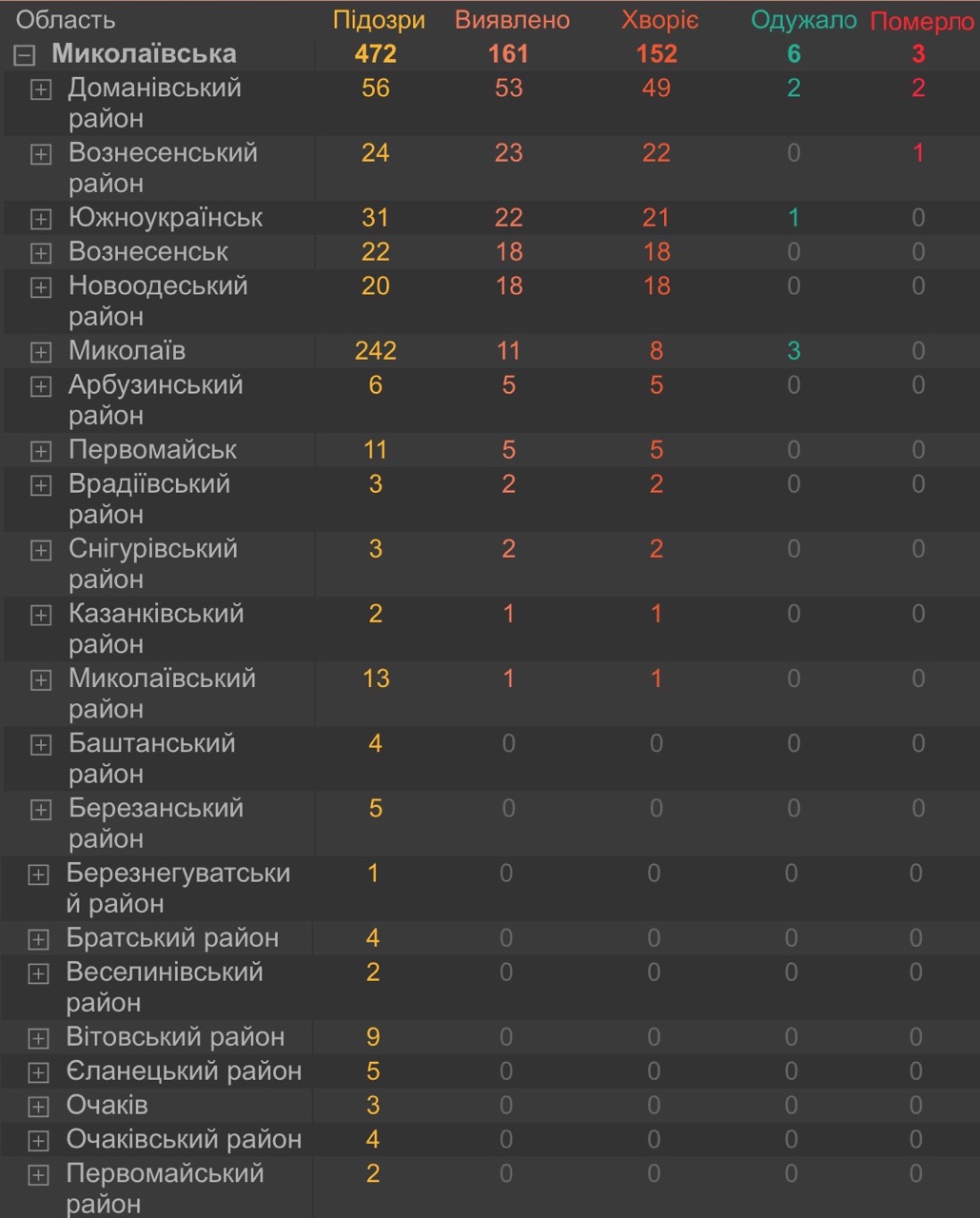 Что касается ситуации по области, то в целом в регионе за время эпидемии на коронавирус подозревали 472 человека, из которых подтверждено на по состоянию на 3 мая 161 случай. Отметим, что по данным Николаевского областного штаба по ликвидации последствий чрезвычайных ситуаций, состоянием на утро 4 мая в регионе уже 163 подтвержденных больных коронавирусом.