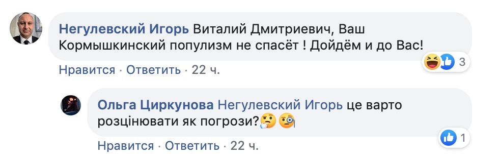 — Виталий Дмитриевич, Ваш Кормышкинский популизм не спасёт ! Дойдём и до Вас!, - написал Игорь Негулевский.