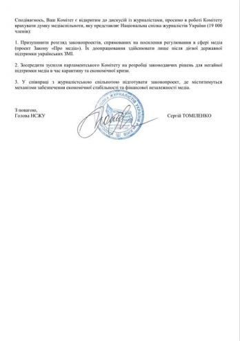 — Национальный союз журналистов Украины призывает профильный Комитет Верховной Рады Украины по вопросам гуманитарной и информационной политики: