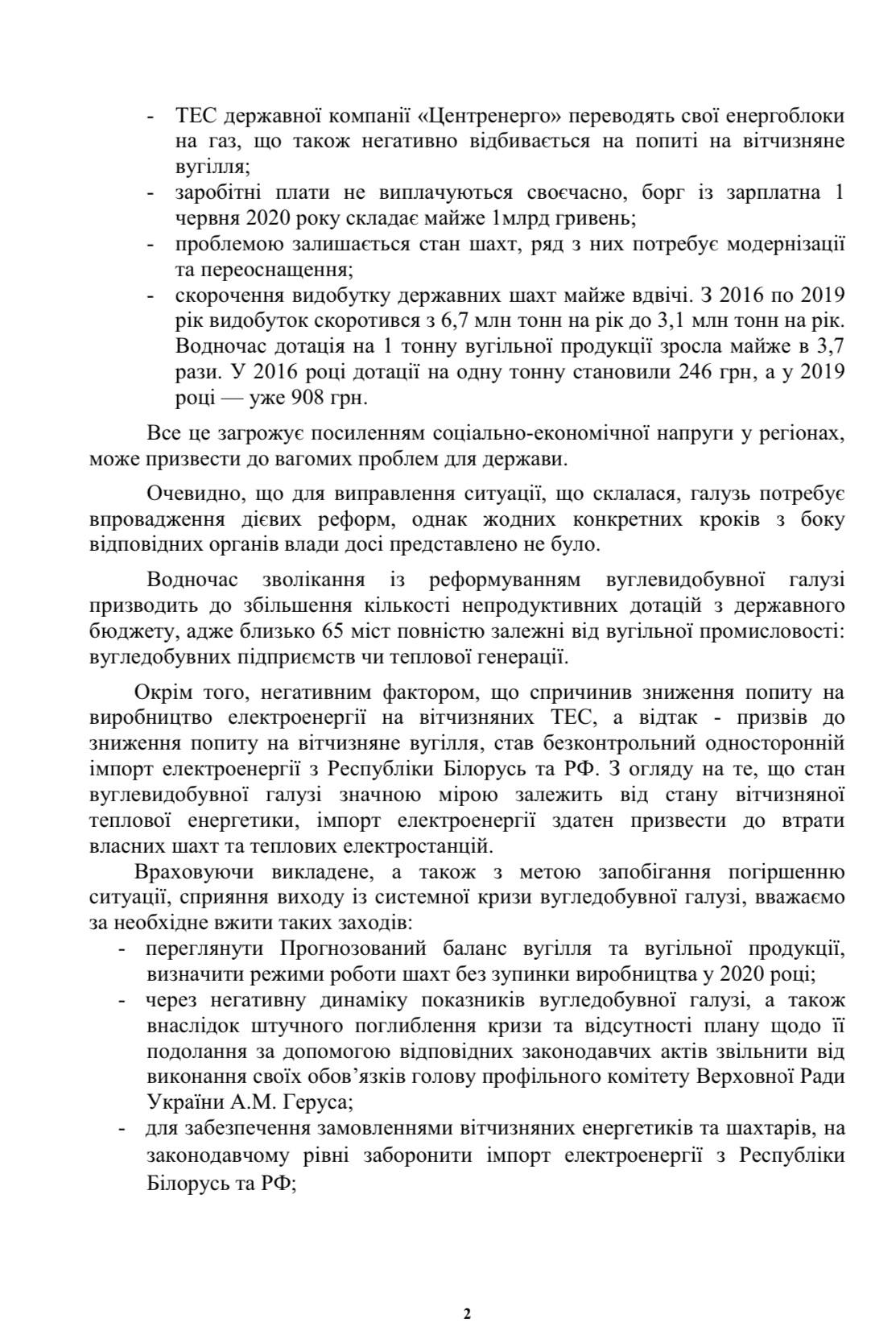 Кроме того, шахтеры требуют уволить главу энергетического парламентского комитета Андрея Геруса, утверждая, что его действия привели к критической ситуации в угледобыче. Также они просят запретить на законодательном уровне импорт электроэнергии из Беларуси и России, который был восстановлен благодаря «поправке Геруса».