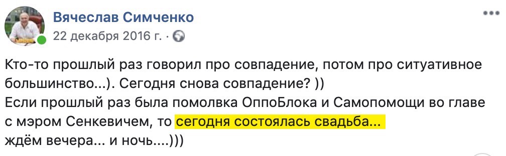 Об этом в декабре 2016 года в Facebook написал тогдашний глава Николаевcкой городской организации партии «Блок Петра Порошенко «Солидарность» Вячеслав Симченко, комментируя итоги очередной сессии, на которой именно голосами фракций «Оппозиционный блок» и «Самопомощь» был проголосован бюджет и утвержден состав исполнительного комитета.