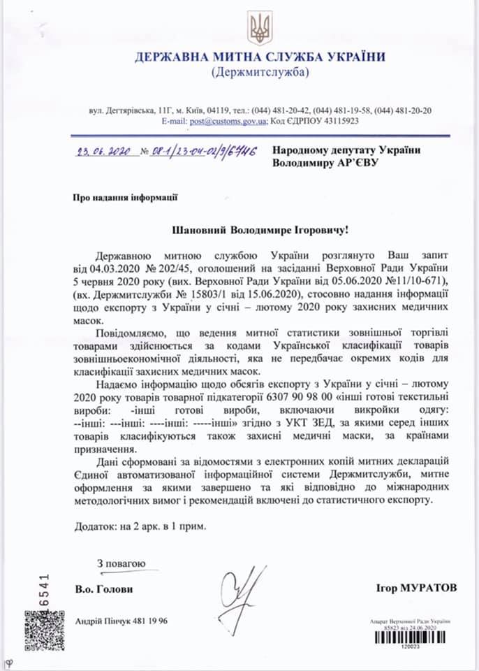 Народный депутат от партии Европейская солидарность Владимир Арьев сообщил, что получил данные от таможни, согласно которым в январе-феврале 2020 года Украина продала за рубеж более 500 тонн медицинских масок.