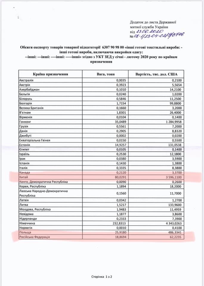 Больше всего масок было экспортировано в Германию, Румынию, Словакию и Китай. Также 18 тонн масок по более низкой цене были проданы в Россию.
