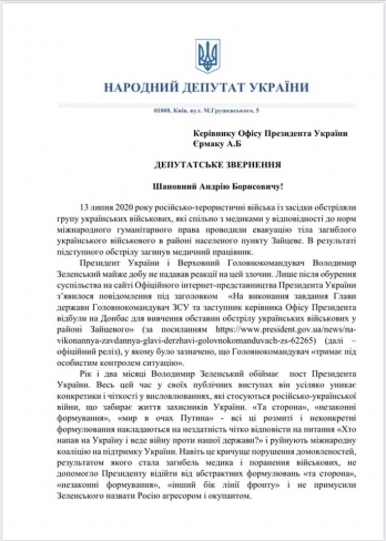 Народный депутат «Евросолидарности» Владимир Арьев направил обращение в офис президента и требует объяснить, что имел в виду президент Владимир Зеленский, когда говорил о «той стороне» на Донбассе.